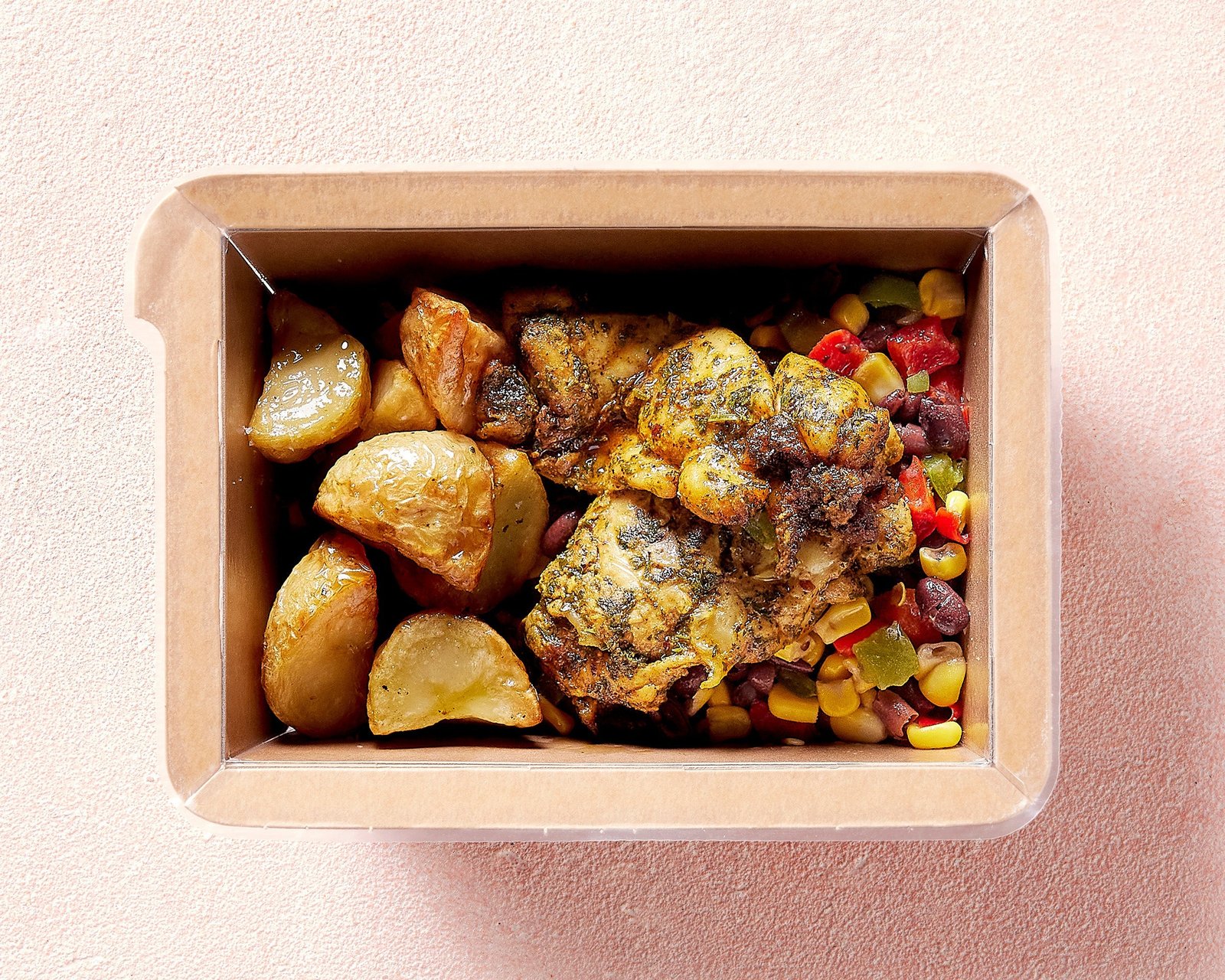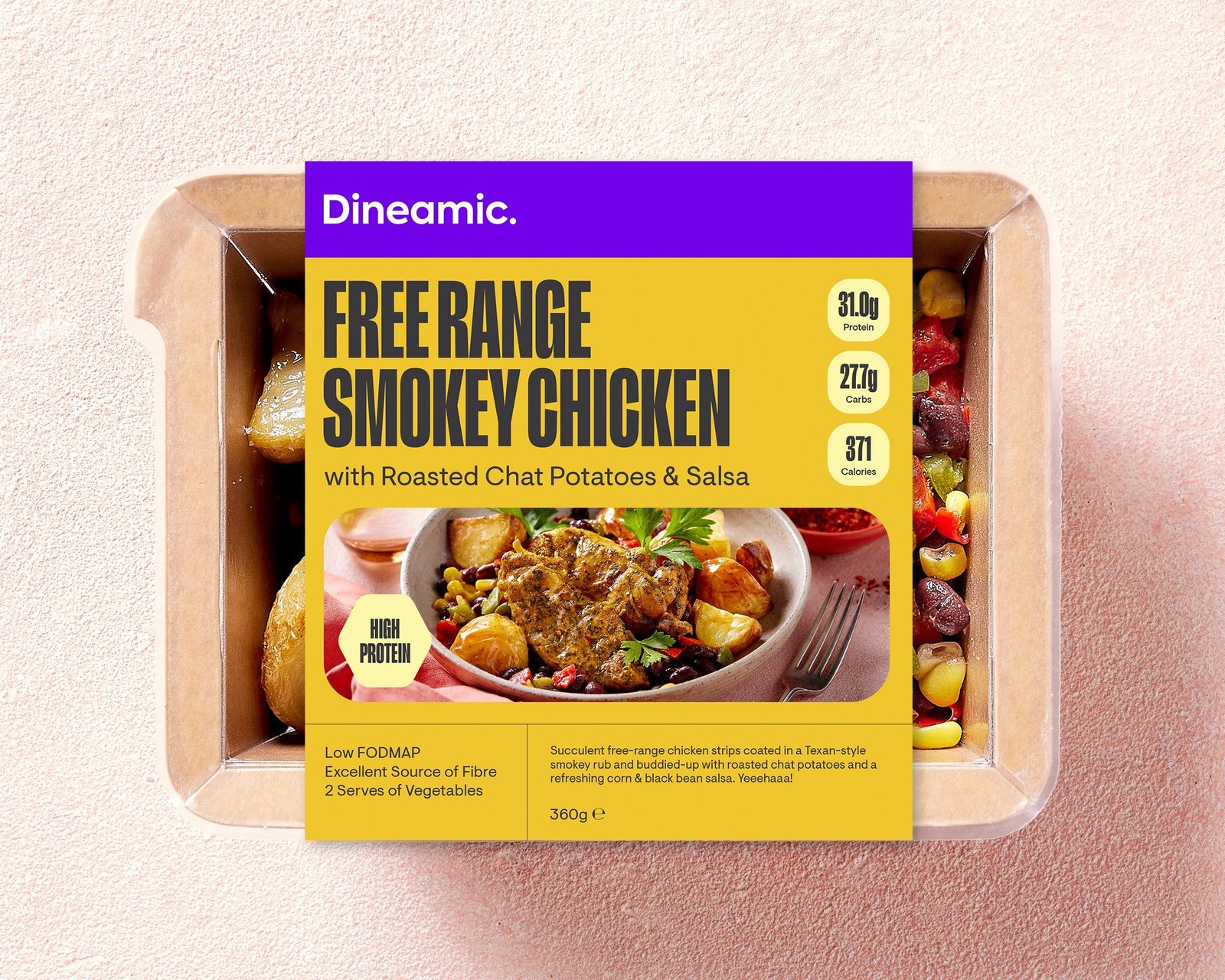 Succulent free-range chicken strips coated in a Texan-style smokey rub and buddied-up with roasted chat potatoes and a refreshing corn & black bean salsa. Yeeehaaa!