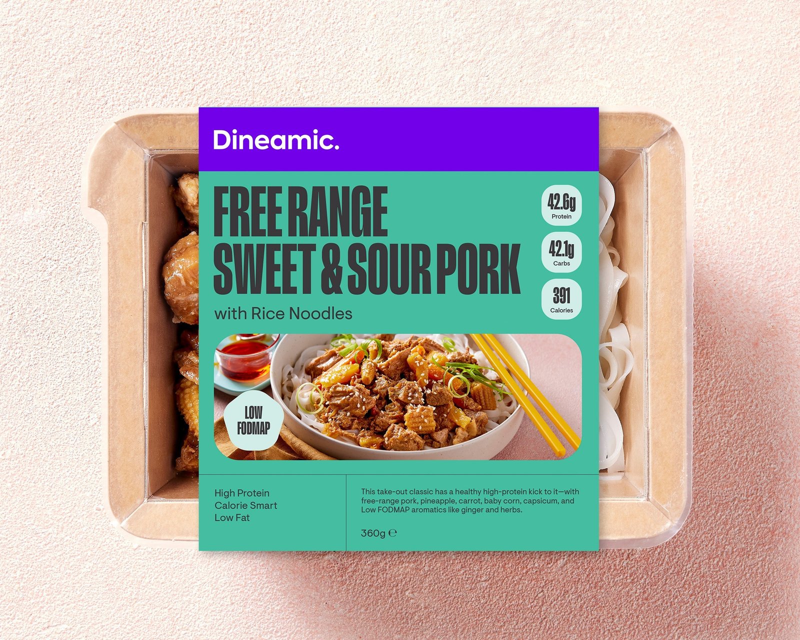 This take-out classic has a healthy high-protein kick to it—with free-range pork, pineapple, carrot, baby corn, capsicum, and aromatics like ginger and herbs.